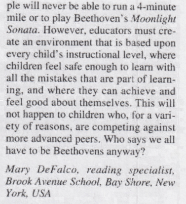 Granting parent requests causes an unbalance in the classroom- all too often it is along ethic lines or among “clicks.” Influential parents can band together asking for a particular teacher who has done her/his “homework” charming parents. When parents’ requests are granted, an unbalanced classroom occurs. All too often the popular teacher gets those students s/he wanted. The best educator, however, isn’t necessarily the most popular. The unbalanced classrooms result in some teachers getting a bad reputation. All the At Risk go to the teacher or teachers whom parents didn’t request. Those teachers get a bad name after a while even though they may be better educators/ teachers. Obviously, if year after year the same teacher gets an overload of At Risk students it will appear that he/she is not a good teacher where in reality he/she may be doing a phenomenal job with the students s/he has. Parents aren’t necessarily good judges.