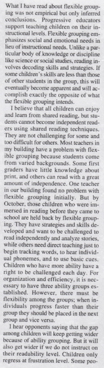 There is a problem with placing all children in the same text. The At Risk are going to be frustrated with the grade-level text and the higher functioning students are going to resent having to read an easier text to accommodate the At Risk/slower child. Plus, the teacher is wasting precious time.