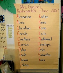 2.Letter each child's name on a flash card and/or chart (large enough for students to see from their seats). Place their names in alphabetical order in a pocket chart. Each day have a short activity with their names; e.g., find all the names that begin with a .... How many last names begin with... How many names have ... in their name? Use a colored marking pen for the first letter of their names. Talk about their names and children will begin to say, "Oh, m is in my name." "Yes, but it is not at the beginning..."