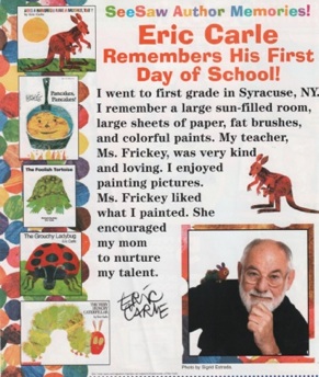 In a lively interview, Carle, 86, reflected on a career that has spanned more than 40 years and included 75 books, among them perennial favorites such as “The Very Hungry Caterpillar,” “Brown Bear, Brown Bear, What do You See?” and “The Grouchy Ladybug.” Carle touched on his art-happy early childhood in the United States, his immigrant parents’ return to Germany when he was 6, and his early career as a graphic designer and art director. He even dished about that beloved caterpillar – the little fellow actually started out as a worm, Carle says.”