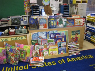 There were tables for guided rdg. lessons, most in the shape of half moon and teacher sitting the center. In the rdg. center was a pocket chart for sentence strips, individual erasable boards for word analysis, ability-level read materials, record-keeping folders and a stand for writing charts.