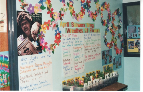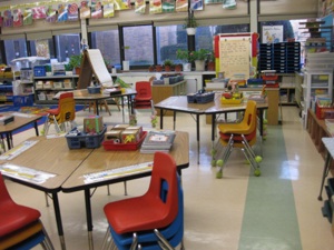 Literacy-rich environments; desks grouped to encourage social interaction; leaning centers around the perimeter... colorful rugs for group meetings, listening to stories, and mine lessons... Calendars, weather charts, helper charts, rules for the class, charts with functional information and a display of children’s work. There was a special chair for the teacher to sit while reading a story to the class. The special chair was also used by children to tell of their experiences and read the stories they wrote o read. Some people call it the “Author’s Chair.” They also had the experience chart-easel..
