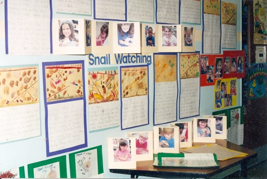 Ms. Davilla’s first grade class science reports- a written report accompanied by an illustration. The photos depict the children observing snails ,
