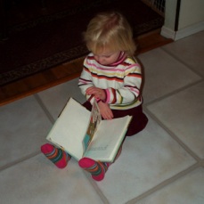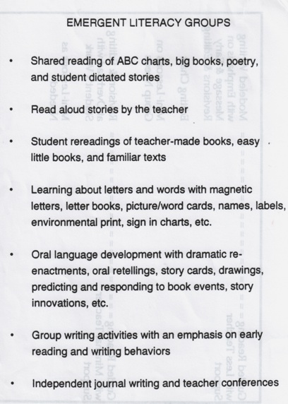 -Child rereads several familiar books or poems. At the emergent level, it is important that the child points to each word as s/he reads. If s/he doesn’t the pattern can easily be picked up and the child can give the impression that s/he is recognizing each word.