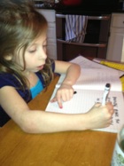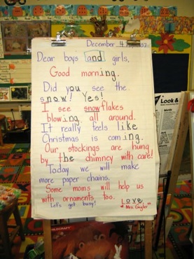 Every child has a writing book. Every day the child composes a brief message. -Have him/her write the word as you stretch it out. Remind him/her of the sound of the first letter. Find it in the alphabet.