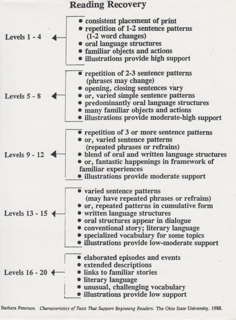 Marie Clay introduced the leveling text - not just readability text determined by DRP or Lexile. Marie Clay’s leveling text focuses on: content, illustrations, length, curriculum, language structure, judgment and format. The student is given a choice of books to read that have an element of challenge. Books are clustered together according to difficulty. The teacher engages in a supportive conversation while doing the “Picture Walk.”