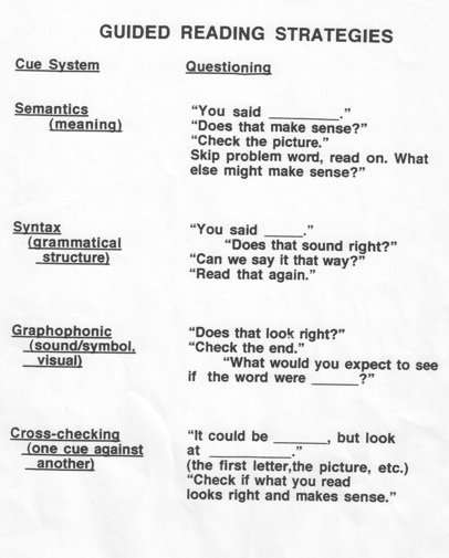 -child’s use of cues: meaning, language syntax, or visual information in print.