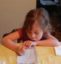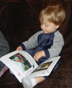 Ellie, reading the book Grandma made of her via photos with captions taken of her involved with various activities.