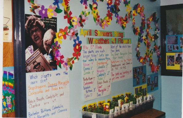 Pre Common Core bulletin boards displaying kindergarten activities