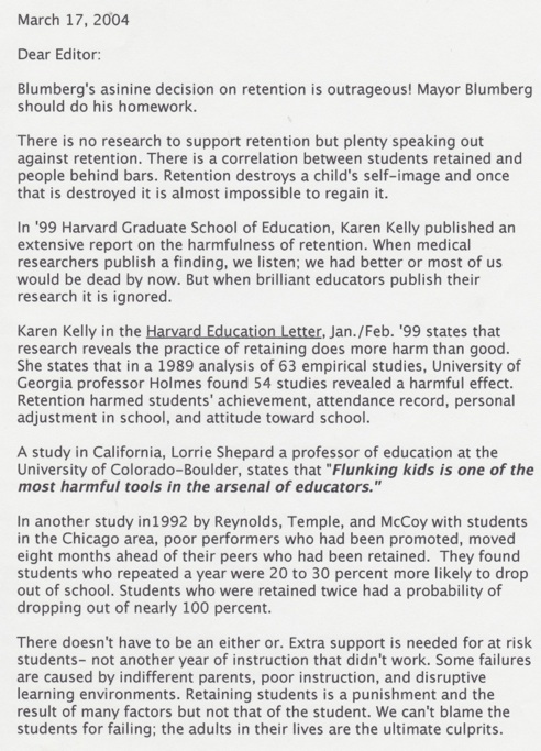 ’99 Harvard Graduate School of Ed. Karen Kelly published and extensive report of the harmfulness of retention.